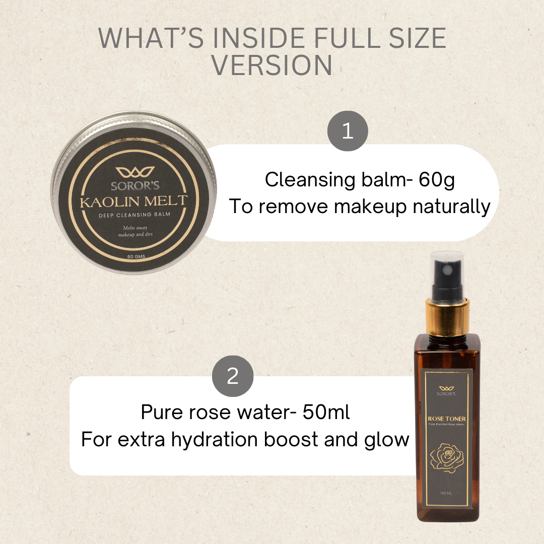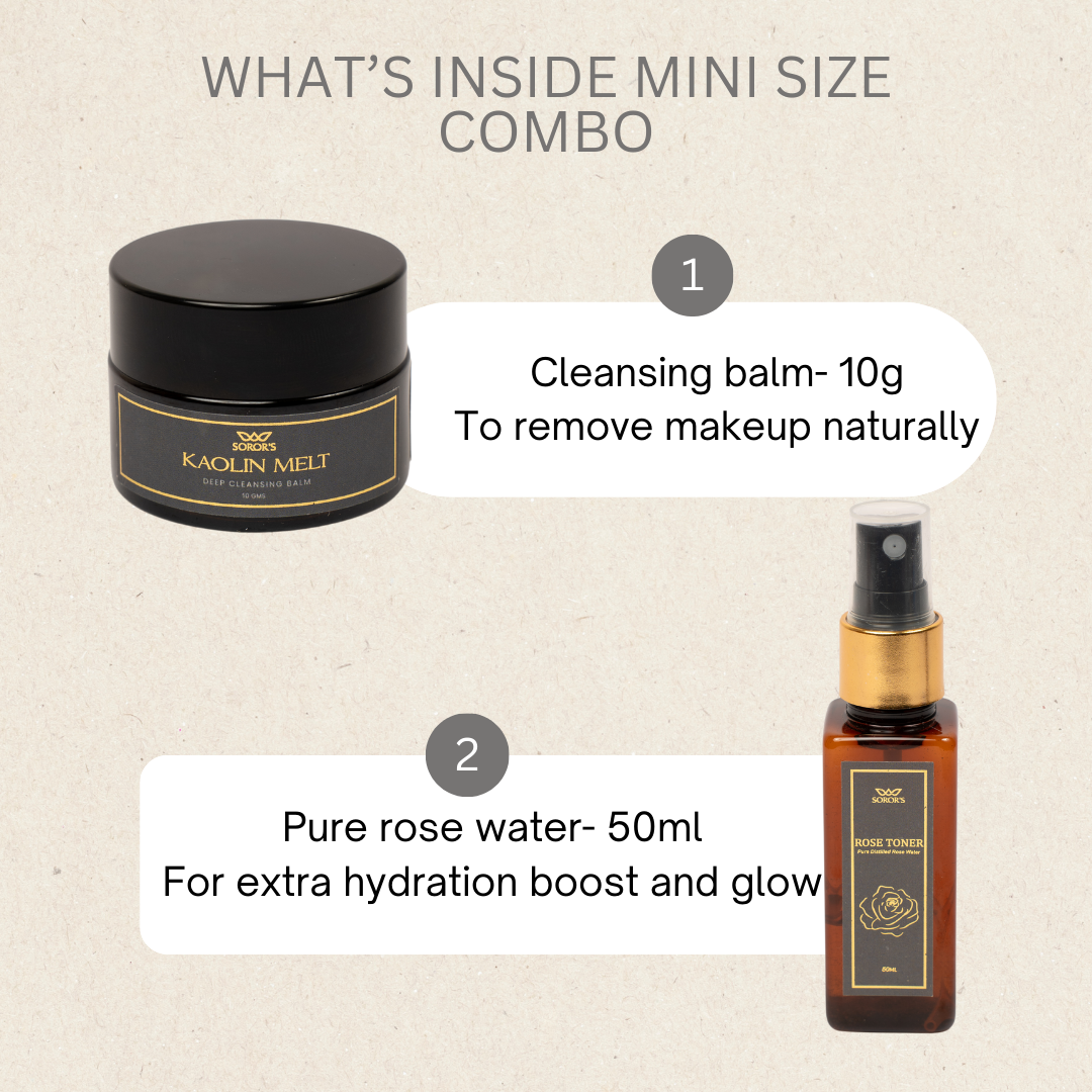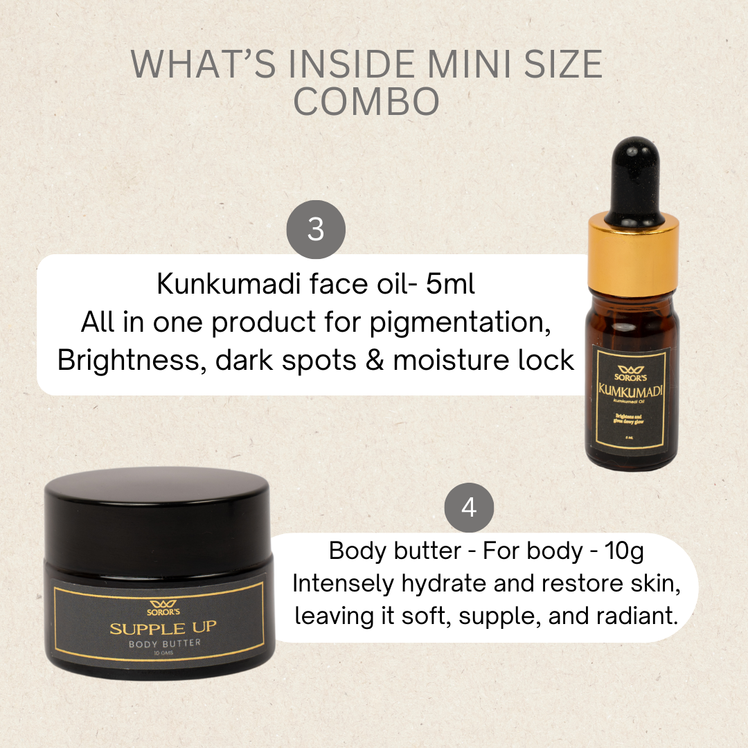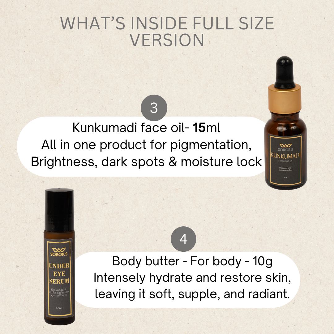 Includes: Rose water mini- 50ml, Kunkumadi oil- 5ml, Kaolin melt- 10g, Supple up – 10g